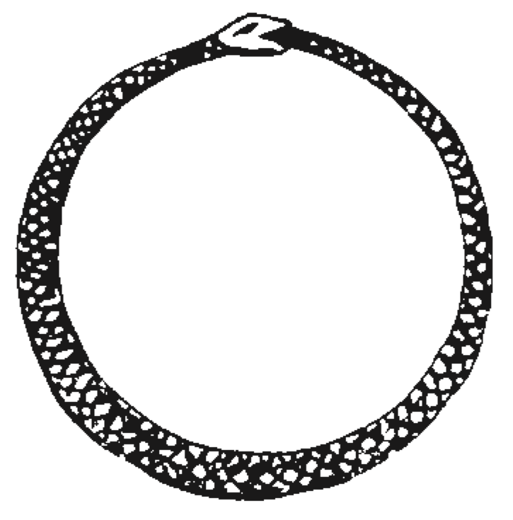 que trague su cola, muestra el ciclo de la eternidad o la gran espiral de la evolución del Manvantara. Este es el círculo de la necesidad de los egipcios, el sendero de las numerosas reencarnaciones del alma, cuyo significado permanece aun considerándolo simplemente como serpiente, ya que periódicamente cambia su piel, como sucede con los numerosos cuerpos del ser humano cada vez que muere. Significa también sabiduría, en cuanto a la Serpiente se le ha llamado el sabio y, según muestra La Doctrina Secreta, la palabra querría decir también los Maestros de la sabiduría y del poder. Su cola que penetra en la boca, implica la rotación perpetua del círculo o la periódica aparición y desaparición del Universo manifestado. Casi cada biblia lo tiene. San Juan habla del gran dragón que con su cola hizo caer una tercera parte de las estrellas a la tierra. Esto implica que, durante esta amplia evolución, la serpiente en cuestión, trajo egos de las estrellas a este globo. En la forma de círculo, simboliza la perfección, ya que es la figura más perfecta, mostrándonos, en sus diferentes relaciones, la gran doctrina según la cual el número y el peso, construyeron el Universo, mientras la armonía, por un momento perturbada y luego restablecida, controla y preside sobre ello.